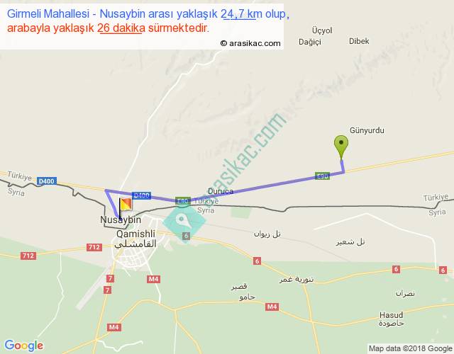 Girmeli Mahallesi - Nusaybin arası yaklaşık olarak 90 km/h ile yukarıda belirtilen sürede olup, iki yerin kuş uçuşu uzaklığı (mesafesi) 19'dir. Yolculuk otobüsle 33 dakika sürmektedir.