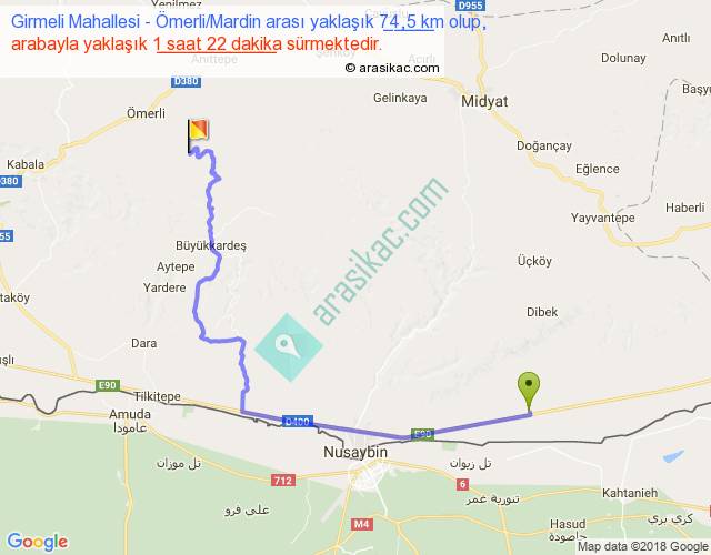 Girmeli Mahallesi - Ömerli Mardin arası yaklaşık olarak 90 km/h ile yukarıda belirtilen sürede olup, iki yerin kuş uçuşu uzaklığı (mesafesi) 46'dir. Yolculuk otobüsle 1 saat 46 dakika sürmektedir.