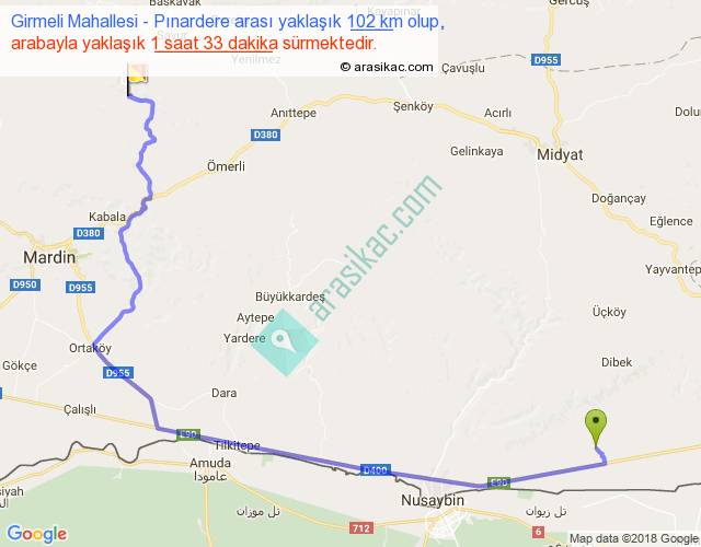 Girmeli Mahallesi - Pınardere arası yaklaşık olarak 90 km/h ile yukarıda belirtilen sürede olup, iki yerin kuş uçuşu uzaklığı (mesafesi) 65'dir. Yolculuk otobüsle 2 saat 0 dakika sürmektedir.