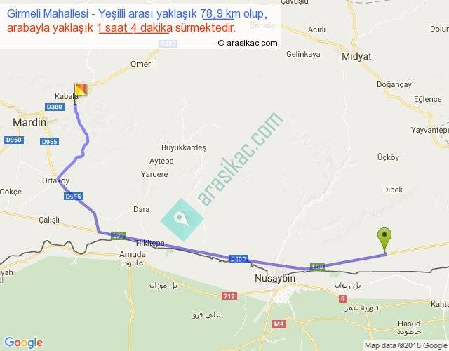 Girmeli Mahallesi - Yeşilli arası yaklaşık olarak 90 km/h ile yukarıda belirtilen sürede olup, iki yerin kuş uçuşu uzaklığı (mesafesi) 59'dir. Yolculuk otobüsle 1 saat 23 dakika sürmektedir.