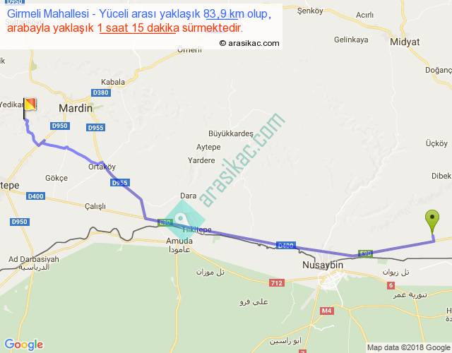 Girmeli Mahallesi - Yüceli arası yaklaşık olarak 90 km/h ile yukarıda belirtilen sürede olup, iki yerin kuş uçuşu uzaklığı (mesafesi) 73'dir. Yolculuk otobüsle 1 saat 37 dakika sürmektedir.