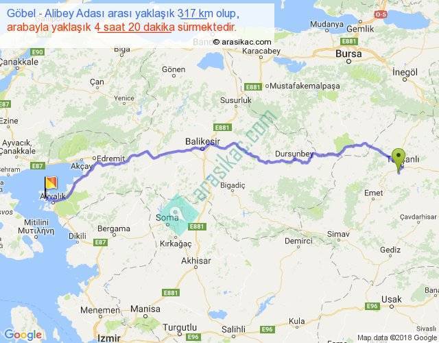 Göbel - Alibey Adası arası yaklaşık olarak 90 km/h ile yukarıda belirtilen sürede olup, iki yerin kuş uçuşu uzaklığı (mesafesi) 242'dir. Yolculuk otobüsle 5 saat 38 dakika sürmektedir.