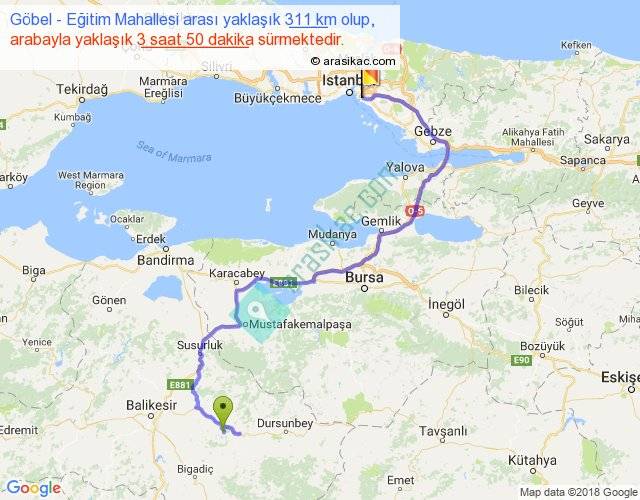 Göbel - Eğitim Mahallesi arası yaklaşık olarak 90 km/h ile yukarıda belirtilen sürede olup, iki yerin kuş uçuşu uzaklığı (mesafesi) 168'dir. Yolculuk otobüsle 4 saat 59 dakika sürmektedir.