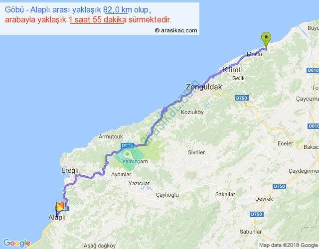 Göbü - Alaplı arası yaklaşık olarak 90 km/h ile yukarıda belirtilen sürede olup, iki yerin kuş uçuşu uzaklığı (mesafesi) 61'dir. Yolculuk otobüsle 2 saat 29 dakika sürmektedir.