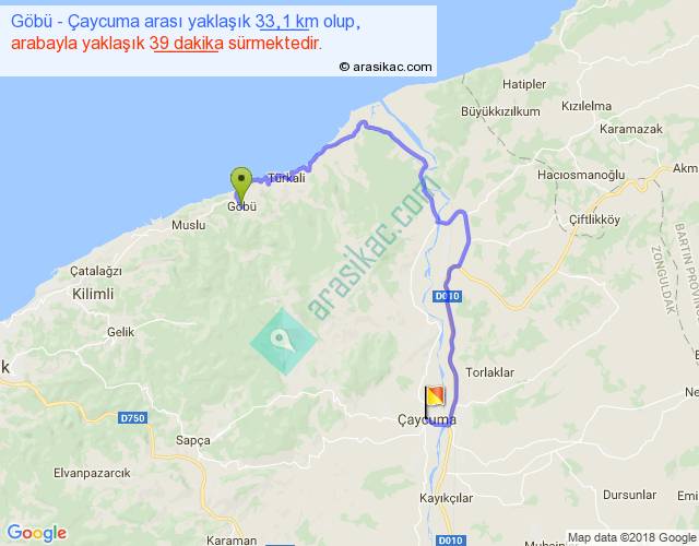 Göbü - Çaycuma arası yaklaşık olarak 90 km/h ile yukarıda belirtilen sürede olup, iki yerin kuş uçuşu uzaklığı (mesafesi) 15'dir. Yolculuk otobüsle 50 dakika sürmektedir.