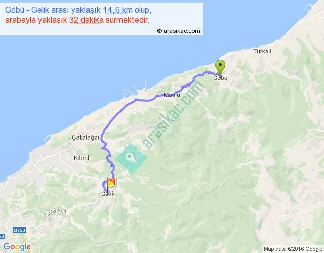 Göbü - Gelik arası yaklaşık olarak 90 km/h ile yukarıda belirtilen sürede olup, iki yerin kuş uçuşu uzaklığı (mesafesi) 9'dir. Yolculuk otobüsle 41 dakika sürmektedir.