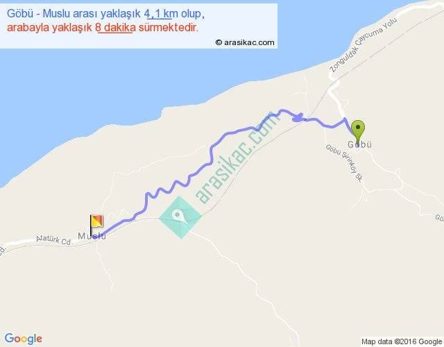 Göbü - Muslu arası yaklaşık olarak 90 km/h ile yukarıda belirtilen sürede olup, iki yerin kuş uçuşu uzaklığı (mesafesi) 3'dir. Yolculuk otobüsle 10 dakika sürmektedir.