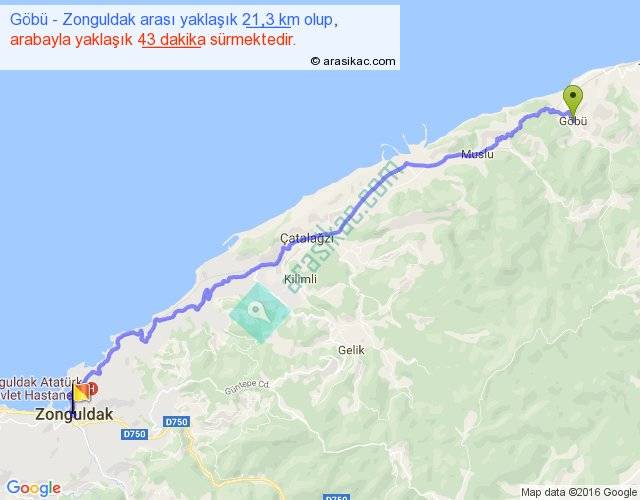 Göbü - Zonguldak arası yaklaşık olarak 90 km/h ile yukarıda belirtilen sürede olup, iki yerin kuş uçuşu uzaklığı (mesafesi) 16'dir. Yolculuk otobüsle 55 dakika sürmektedir.
