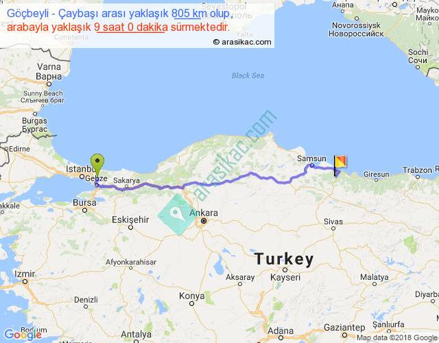 Göçbeyli - Çaybaşı arası yaklaşık olarak 90 km/h ile yukarıda belirtilen sürede olup, iki yerin kuş uçuşu uzaklığı (mesafesi) 637'dir. Eğer belirtilen yerler arasında uçak seferi var ise bu süre uçakla 58 dakika'ya kadar düşebilir. Yolculuk otobüsle 11 saat 42 dakika sürmektedir.