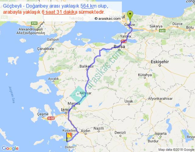 Göçbeyli - Doğanbey arası yaklaşık olarak 90 km/h ile yukarıda belirtilen sürede olup, iki yerin kuş uçuşu uzaklığı (mesafesi) 419'dir. Eğer belirtilen yerler arasında uçak seferi var ise bu süre uçakla 38 dakika'ya kadar düşebilir. Yolculuk otobüsle 8 saat 28 dakika sürmektedir.