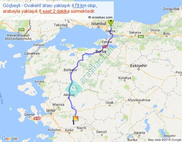 Göçbeyli - Ovakent arası yaklaşık olarak 90 km/h ile yukarıda belirtilen sürede olup, iki yerin kuş uçuşu uzaklığı (mesafesi) 340'dir. Eğer belirtilen yerler arasında uçak seferi var ise bu süre uçakla 31 dakika'ya kadar düşebilir. Yolculuk otobüsle 7 saat 50 dakika sürmektedir.