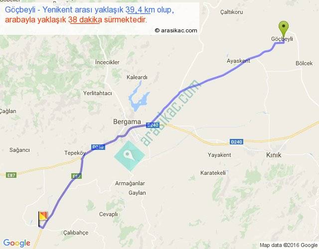 Göçbeyli - Yenikent arası yaklaşık olarak 90 km/h ile yukarıda belirtilen sürede olup, iki yerin kuş uçuşu uzaklığı (mesafesi) 36'dir. Yolculuk otobüsle 49 dakika sürmektedir.