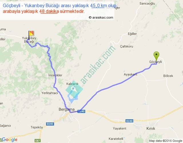 Göçbeyli - Yukarıbey Bucağı arası yaklaşık olarak 90 km/h ile yukarıda belirtilen sürede olup, iki yerin kuş uçuşu uzaklığı (mesafesi) 27'dir. Yolculuk otobüsle 1 saat 2 dakika sürmektedir.