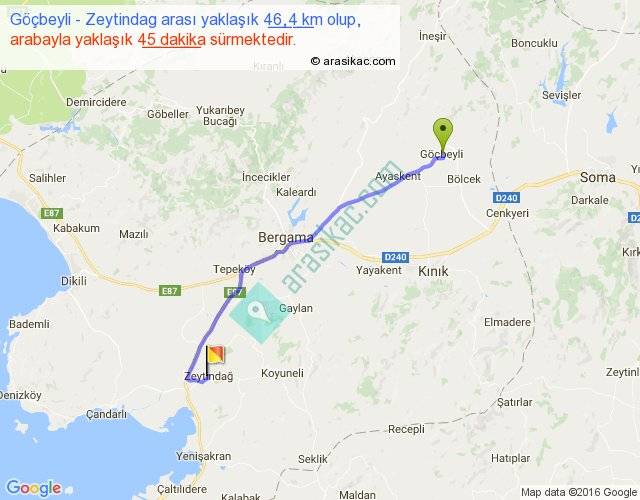 Göçbeyli - Zeytindag arası yaklaşık olarak 90 km/h ile yukarıda belirtilen sürede olup, iki yerin kuş uçuşu uzaklığı (mesafesi) 38'dir. Yolculuk otobüsle 58 dakika sürmektedir.