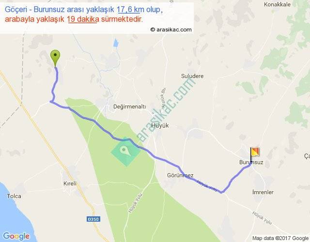 Göçeri - Burunsuz arası yaklaşık olarak 90 km/h ile yukarıda belirtilen sürede olup, iki yerin kuş uçuşu uzaklığı (mesafesi) 13'dir. Yolculuk otobüsle 24 dakika sürmektedir.