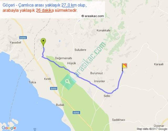 Göçeri - Çamlıca arası yaklaşık olarak 90 km/h ile yukarıda belirtilen sürede olup, iki yerin kuş uçuşu uzaklığı (mesafesi) 19'dir. Yolculuk otobüsle 33 dakika sürmektedir.
