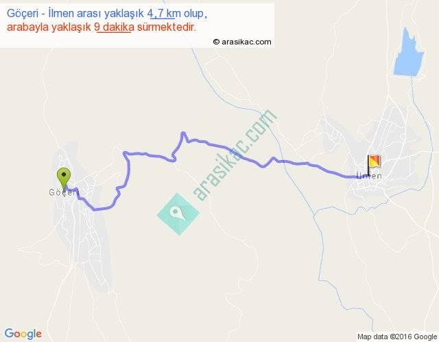 Göçeri - İlmen arası yaklaşık olarak 90 km/h ile yukarıda belirtilen sürede olup, iki yerin kuş uçuşu uzaklığı (mesafesi) 3'dir. Yolculuk otobüsle 11 dakika sürmektedir.