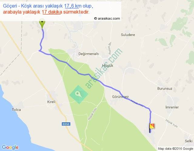 Göçeri - Köşk arası yaklaşık olarak 90 km/h ile yukarıda belirtilen sürede olup, iki yerin kuş uçuşu uzaklığı (mesafesi) 15'dir. Yolculuk otobüsle 22 dakika sürmektedir.