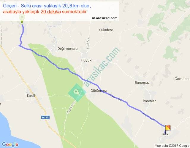 Göçeri - Selki arası yaklaşık olarak 90 km/h ile yukarıda belirtilen sürede olup, iki yerin kuş uçuşu uzaklığı (mesafesi) 18'dir. Yolculuk otobüsle 26 dakika sürmektedir.