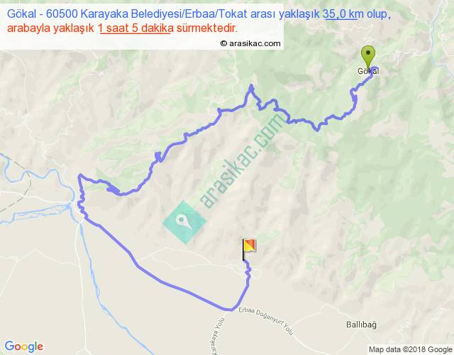Gökal - 60500 Karayaka Belediyesi Erbaa Tokat arası yaklaşık olarak 90 km/h ile yukarıda belirtilen sürede olup, iki yerin kuş uçuşu uzaklığı (mesafesi) 9'dir. Yolculuk otobüsle 1 saat 24 dakika sürmektedir.