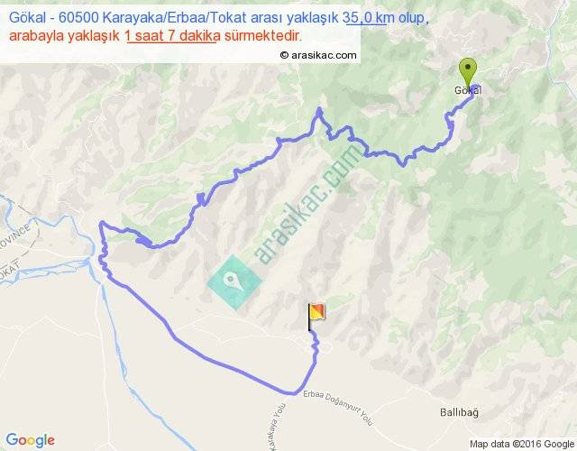Gökal - 60500 Karayaka Erbaa Tokat arası yaklaşık olarak 90 km/h ile yukarıda belirtilen sürede olup, iki yerin kuş uçuşu uzaklığı (mesafesi) 9'dir. Yolculuk otobüsle 1 saat 27 dakika sürmektedir.