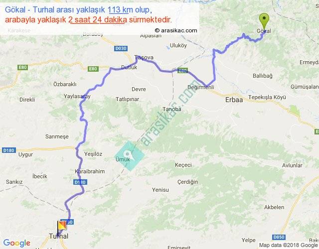 Gökal - Turhal arası yaklaşık olarak 90 km/h ile yukarıda belirtilen sürede olup, iki yerin kuş uçuşu uzaklığı (mesafesi) 67'dir. Yolculuk otobüsle 3 saat 7 dakika sürmektedir.
