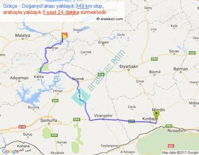 Gökçe - Doğanyol arası yaklaşık olarak 90 km/h ile yukarıda belirtilen sürede olup, iki yerin kuş uçuşu uzaklığı (mesafesi) 5'dir. Yolculuk otobüsle 14 dakika sürmektedir.