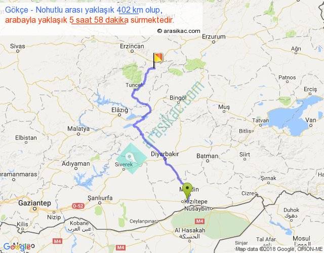 Gökçe - Nohutlu arası yaklaşık olarak 90 km/h ile yukarıda belirtilen sürede olup, iki yerin kuş uçuşu uzaklığı (mesafesi) 258'dir. Eğer belirtilen yerler arasında uçak seferi var ise bu süre uçakla 23 dakika'ya kadar düşebilir. Yolculuk otobüsle 7 saat 45 dakika sürmektedir.