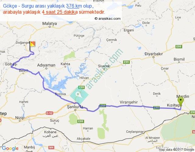 Gökçe - Surgu arası yaklaşık olarak 90 km/h ile yukarıda belirtilen sürede olup, iki yerin kuş uçuşu uzaklığı (mesafesi) 254'dir. Eğer belirtilen yerler arasında uçak seferi var ise bu süre uçakla 23 dakika'ya kadar düşebilir. Yolculuk otobüsle 5 saat 44 dakika sürmektedir.