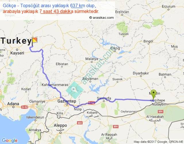 Gökçe - Topsöğüt arası yaklaşık olarak 90 km/h ile yukarıda belirtilen sürede olup, iki yerin kuş uçuşu uzaklığı (mesafesi) 441'dir. Eğer belirtilen yerler arasında uçak seferi var ise bu süre uçakla 40 dakika'ya kadar düşebilir. Yolculuk otobüsle 10 saat 1 dakika sürmektedir.