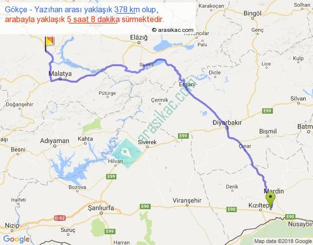 Gökçe - Yazıhan arası yaklaşık olarak 90 km/h ile yukarıda belirtilen sürede olup, iki yerin kuş uçuşu uzaklığı (mesafesi) 268'dir. Eğer belirtilen yerler arasında uçak seferi var ise bu süre uçakla 24 dakika'ya kadar düşebilir. Yolculuk otobüsle 6 saat 40 dakika sürmektedir.