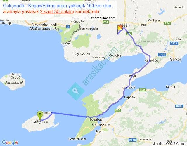 Gökçeada - Keşan Edirne arası yaklaşık olarak 90 km/h ile yukarıda belirtilen sürede olup, iki yerin kuş uçuşu uzaklığı (mesafesi) 92'dir. Yolculuk otobüsle 3 saat 21 dakika sürmektedir.