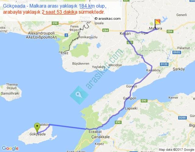 Gökçeada - Malkara arası yaklaşık olarak 90 km/h ile yukarıda belirtilen sürede olup, iki yerin kuş uçuşu uzaklığı (mesafesi) 120'dir. Yolculuk otobüsle 3 saat 44 dakika sürmektedir.
