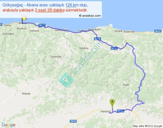 Gökçeağaç - Abana arası yaklaşık olarak 90 km/h ile yukarıda belirtilen sürede olup, iki yerin kuş uçuşu uzaklığı (mesafesi) 55'dir. Yolculuk otobüsle 3 saat 12 dakika sürmektedir.