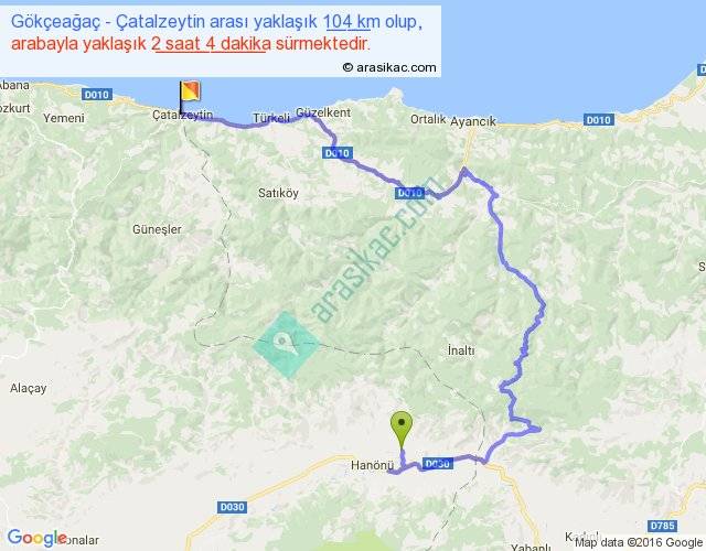 Gökçeağaç - Çatalzeytin arası yaklaşık olarak 90 km/h ile yukarıda belirtilen sürede olup, iki yerin kuş uçuşu uzaklığı (mesafesi) 41'dir. Yolculuk otobüsle 2 saat 41 dakika sürmektedir.