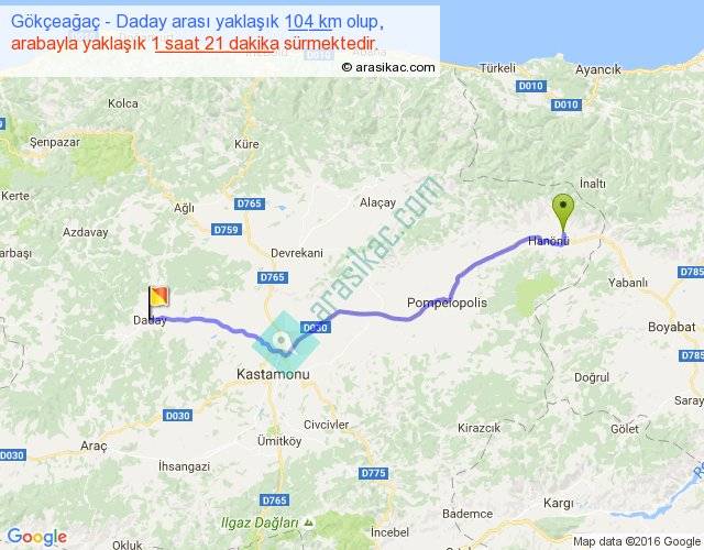 Gökçeağaç - Daday arası yaklaşık olarak 90 km/h ile yukarıda belirtilen sürede olup, iki yerin kuş uçuşu uzaklığı (mesafesi) 87'dir. Yolculuk otobüsle 1 saat 45 dakika sürmektedir.
