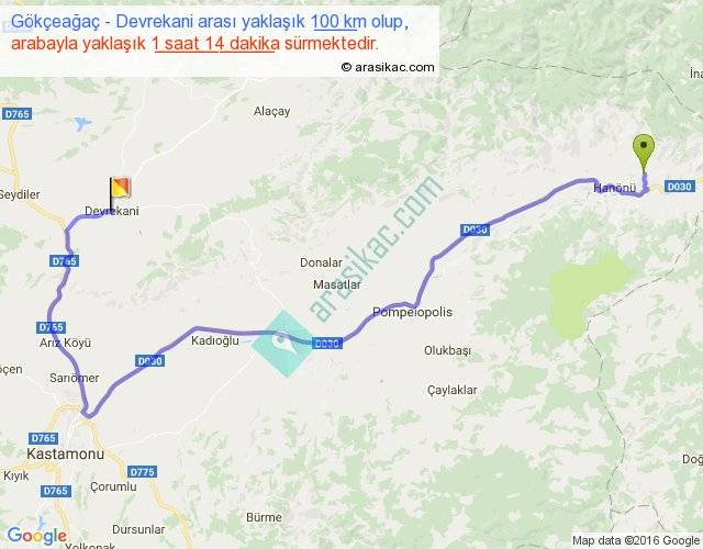 Gökçeağaç - Devrekani arası yaklaşık olarak 90 km/h ile yukarıda belirtilen sürede olup, iki yerin kuş uçuşu uzaklığı (mesafesi) 55'dir. Yolculuk otobüsle 1 saat 36 dakika sürmektedir.
