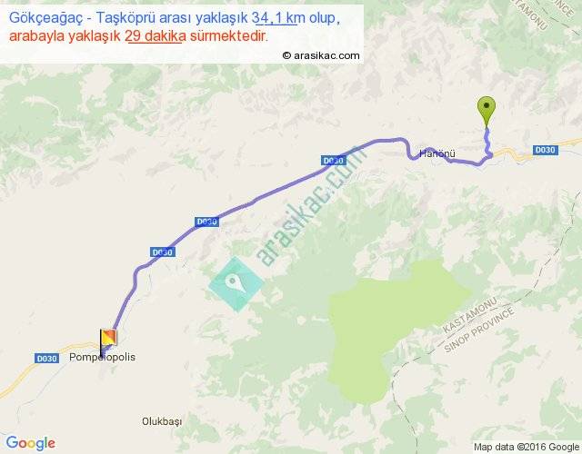 Gökçeağaç - Taşköprü arası yaklaşık olarak 90 km/h ile yukarıda belirtilen sürede olup, iki yerin kuş uçuşu uzaklığı (mesafesi) 28'dir. Yolculuk otobüsle 37 dakika sürmektedir.