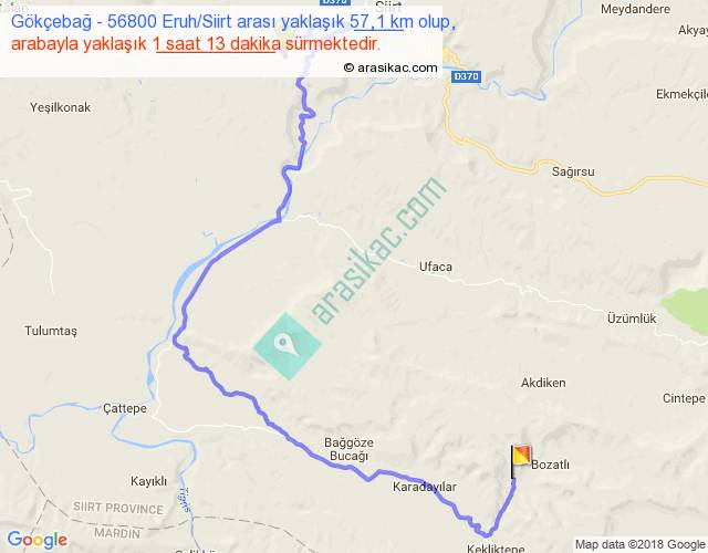 Gökçebağ - 56800 Eruh Siirt arası yaklaşık olarak 90 km/h ile yukarıda belirtilen sürede olup, iki yerin kuş uçuşu uzaklığı (mesafesi) 26'dir. Yolculuk otobüsle 1 saat 34 dakika sürmektedir.