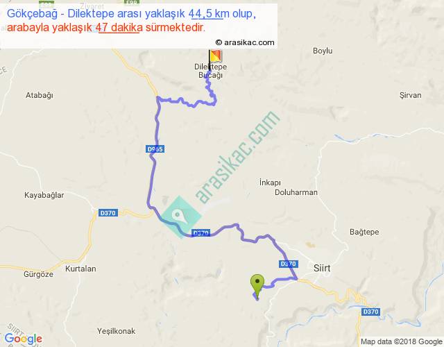 Gökçebağ - Dilektepe arası yaklaşık olarak 90 km/h ile yukarıda belirtilen sürede olup, iki yerin kuş uçuşu uzaklığı (mesafesi) 20'dir. Yolculuk otobüsle 1 saat 1 dakika sürmektedir.