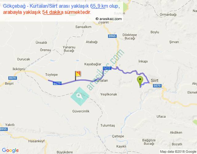 Gökçebağ - Kurtalan Siirt arası yaklaşık olarak 90 km/h ile yukarıda belirtilen sürede olup, iki yerin kuş uçuşu uzaklığı (mesafesi) 25'dir. Yolculuk otobüsle 1 saat 10 dakika sürmektedir.