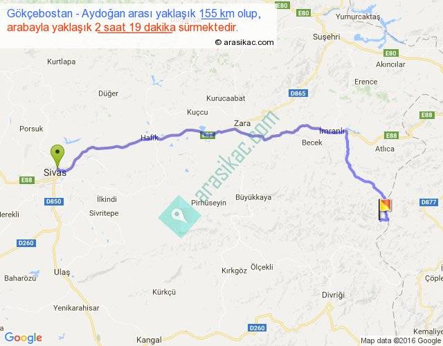 Gökçebostan - Aydoğan arası yaklaşık olarak 90 km/h ile yukarıda belirtilen sürede olup, iki yerin kuş uçuşu uzaklığı (mesafesi) 110'dir. Yolculuk otobüsle 3 saat 0 dakika sürmektedir.