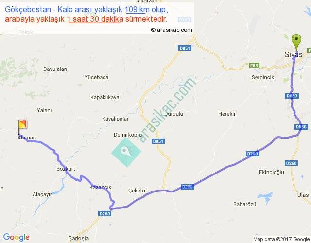 Gökçebostan - Kale arası yaklaşık olarak 90 km/h ile yukarıda belirtilen sürede olup, iki yerin kuş uçuşu uzaklığı (mesafesi) 70'dir. Yolculuk otobüsle 1 saat 57 dakika sürmektedir.