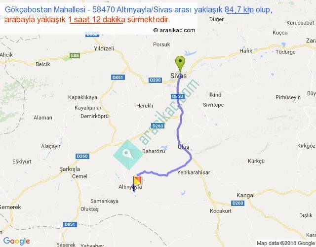 Gökçebostan Mahallesi - 58470 Altınyayla Sivas arası yaklaşık olarak 90 km/h ile yukarıda belirtilen sürede olup, iki yerin kuş uçuşu uzaklığı (mesafesi) 60'dir. Yolculuk otobüsle 1 saat 33 dakika sürmektedir.