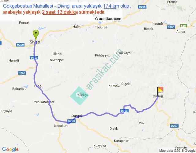 Gökçebostan Mahallesi - Divriği arası yaklaşık olarak 90 km/h ile yukarıda belirtilen sürede olup, iki yerin kuş uçuşu uzaklığı (mesafesi) 103'dir. Yolculuk otobüsle 2 saat 52 dakika sürmektedir.