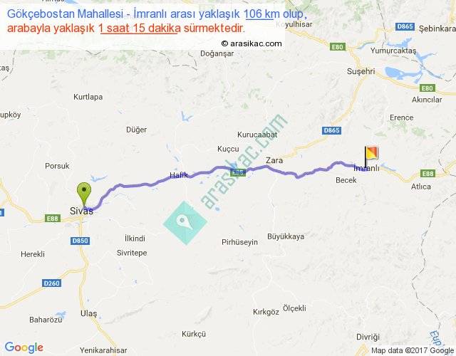 Gökçebostan Mahallesi - İmranlı arası yaklaşık olarak 90 km/h ile yukarıda belirtilen sürede olup, iki yerin kuş uçuşu uzaklığı (mesafesi) 93'dir. Yolculuk otobüsle 1 saat 37 dakika sürmektedir.