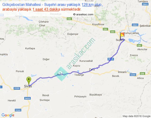 Gökçebostan Mahallesi - Suşehri arası yaklaşık olarak 90 km/h ile yukarıda belirtilen sürede olup, iki yerin kuş uçuşu uzaklığı (mesafesi) 101'dir. Yolculuk otobüsle 2 saat 13 dakika sürmektedir.