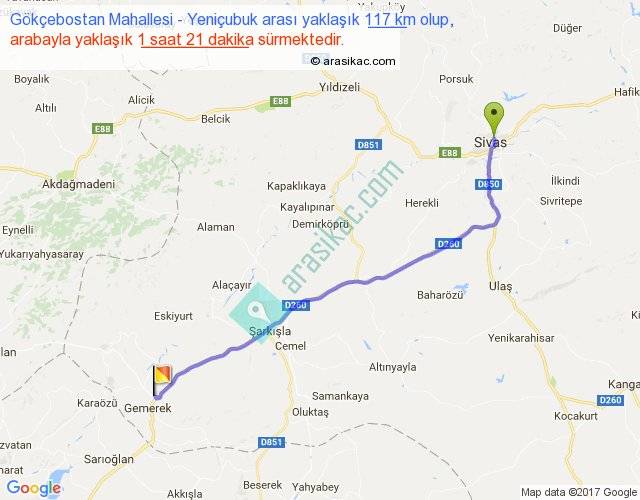 Gökçebostan Mahallesi - Yeniçubuk arası yaklaşık olarak 90 km/h ile yukarıda belirtilen sürede olup, iki yerin kuş uçuşu uzaklığı (mesafesi) 100'dir. Yolculuk otobüsle 1 saat 45 dakika sürmektedir.
