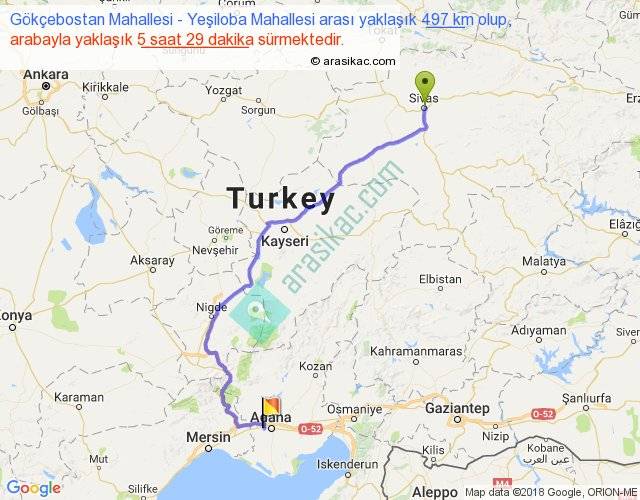 Gökçebostan Mahallesi - Yeşiloba Mahallesi arası yaklaşık olarak 90 km/h ile yukarıda belirtilen sürede olup, iki yerin kuş uçuşu uzaklığı (mesafesi) 342'dir. Eğer belirtilen yerler arasında uçak seferi var ise bu süre uçakla 31 dakika'ya kadar düşebilir. Yolculuk otobüsle 7 saat 7 dakika sürmektedir.