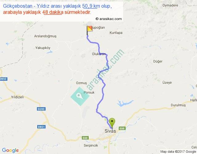 Gökçebostan - Yıldız arası yaklaşık olarak 90 km/h ile yukarıda belirtilen sürede olup, iki yerin kuş uçuşu uzaklığı (mesafesi) 37'dir. Yolculuk otobüsle 1 saat 2 dakika sürmektedir.